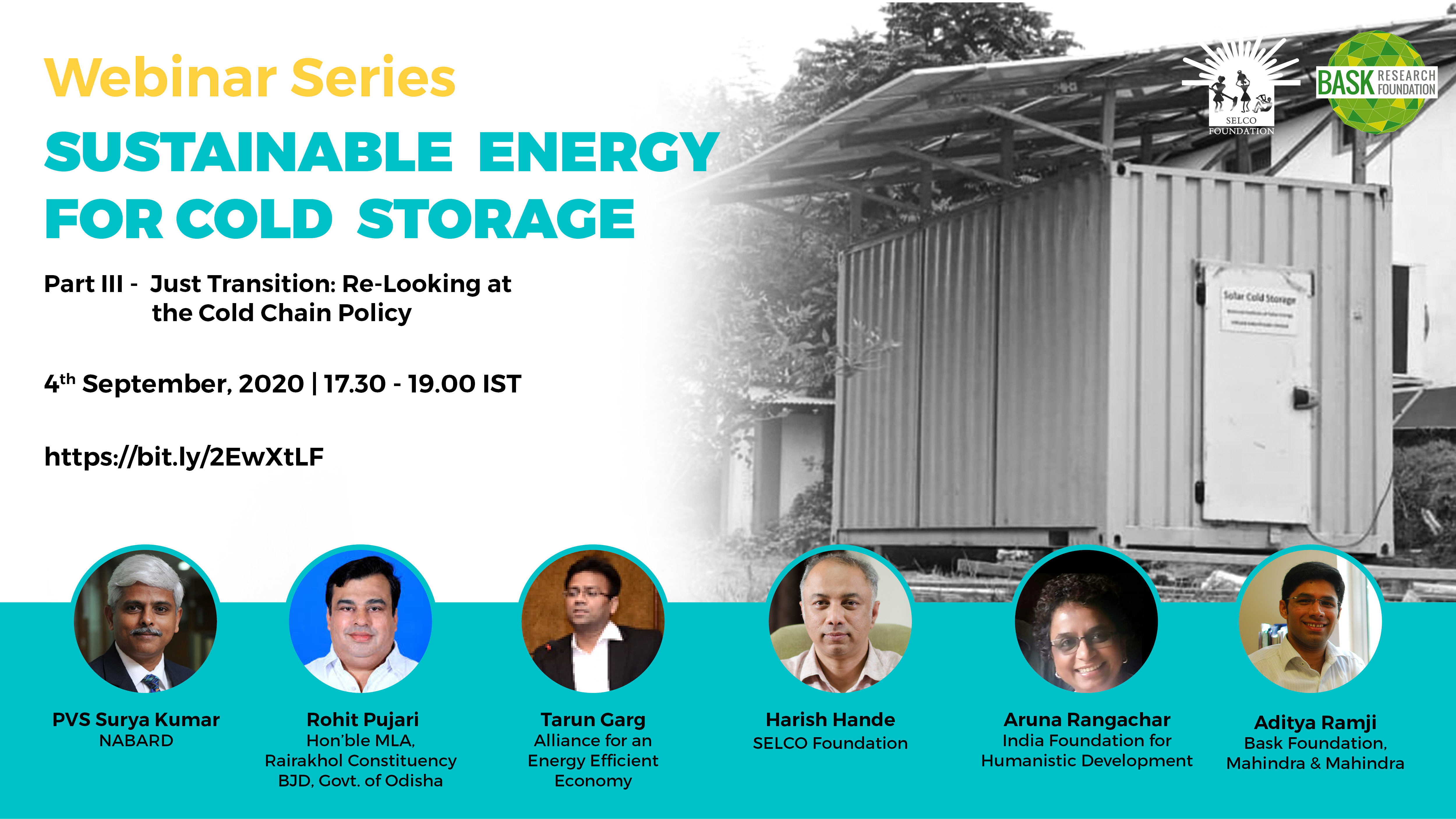 The third webinar in the series by SELCO Foundation and CEEP focused on sustainable energy for cold storage and just transition. It highlighted how inadequate storage infrastructure hampers farmers' bargaining power and their ability to secure fair prices for their produce. The session concluded that cold storage finance should combine grants and loans, as farm produce aggregators struggle to reach break-even within four years.